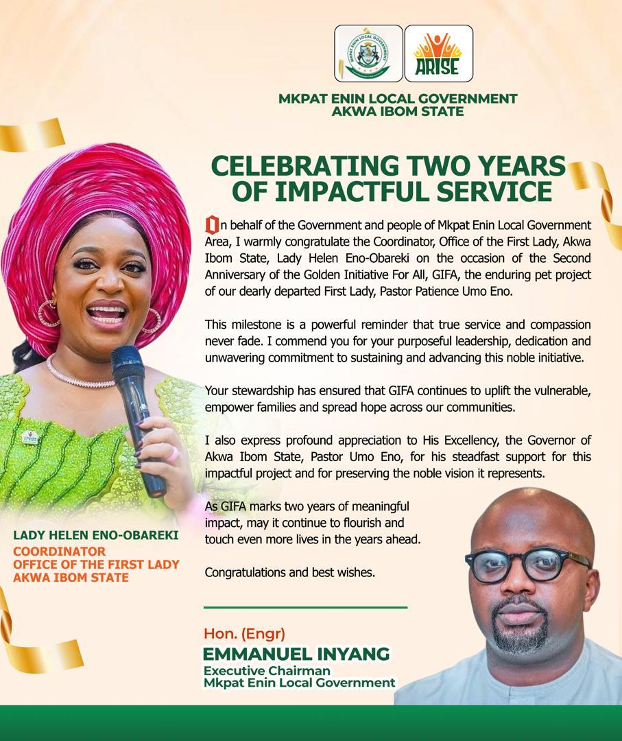 In a goodwill message issued on behalf of the government and people of Mkpat Enin Local Government Area, Engr. Inyang described the milestone as a